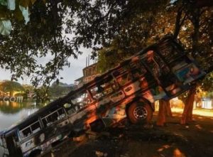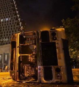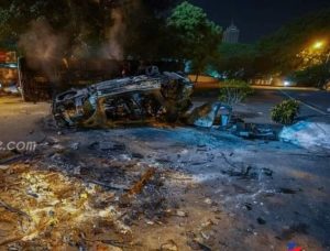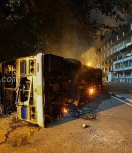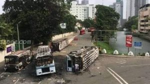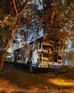 கொழும்பில் அரசுக்கு எதிரான போராட்டக்காரர்கள் மீது மஹிந்த ராஜபக்ஸவுக்கு ஆதரவான காடையர்கள் குழு நடத்திய தாக்குதல் சம்பவத்தை தொடர்ந்து உருவான வன்செயல்களில் வாகனங்கள் தீயிட்டு கொழுத்தப்பட்டு எரிந்து கிடக்கும் காட்சிகளை காண முடிகிறது.