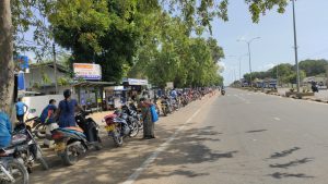 கிளிநொச்சி மாவட்டத்தில்  எரிபொருளுக்காக இன்றும்  மிக நீண்ட வரிசையில் மக்கள் காத்திருந்து எரிபொருள் நிரப்பி சென்றதை அவதானிக்க முடிந்ததாகவும்  கிளிநொச்சியில் உள்ள அனைத்து எரிபொருள் நிரப்பு நிலையங்களிலும் பெட்ரோல் மற்றும் டீசல்  பெற்றுக் கொள்வதற்காக தங்களுடைய வாகனங்களுடன் மக்கள் மிக நீண்ட வரிசையில் காத்திருந்து பெற்று சென்றதை அவதானிக்க  முடிநடததாக எமது பிராந்திய செய்தியாளர் தெரிவிக்கின்றார்