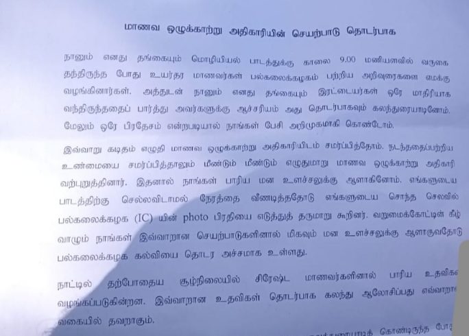 அதுமட்டுமில்லாது தமது பிரச்சினைகள் தொடர்பில் பல்கலைக்கழக மாணவர் ஒன்றியத்திற்கு தெரியப்படுத்தாமல் அச்சுறுத்தும் வகையில் ஒழுக்காற்று அதிகாரி செய்யப்பட்டதாக தெரிவித்துள்ளனர்.