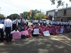 எரிபொருள் வழங்கலை நெறிப்படுத்த வேண்டிய மூதூர் பிரதேச செயலக உத்தியோகத்தர்கள் எரிபொருளைக் கோரியும் இராணுவத்தினரின் தரக்குறைவான செயற்பாடுகளுக்கு கண்டனம் தெரிவித்தும் பிரதேச செயலகத்துக்கு முன்பாக உள்ள பிரதான வீதியை மறித்து நேற்று காலை மூன்று மணி நேரமாகப் போராட்டத்தில் ஈடுபட்டனர்