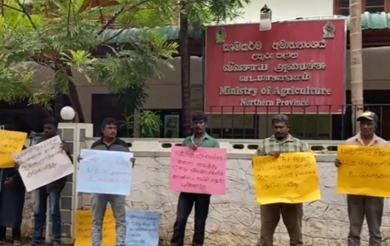 மன்னார் மாவட்டச் செயலர் எங்கள் விவசாய காணிகளை பாதிரியார் ஒருவருக்கு தரைவார்க்க முயற்சிக்கிறார். எனக்கூறி யாழ்.பருத்தித்துறை வீதியில் உள்ள வடமாகாண விவசாய அமைச்சின் முன்னால் விவசாயிகளால்  போராட்டம் ஒன்று நேற்று நடாத்தப்பட்டுடள்ளது.