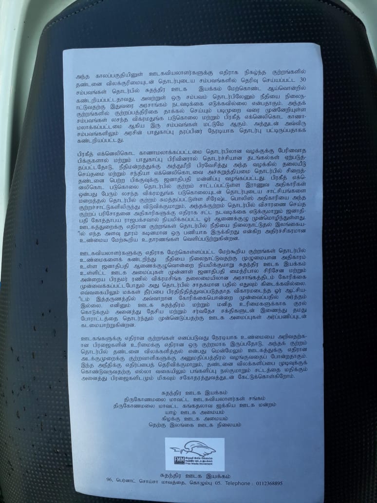 இந்த சர்வதேச தினத்தையிட்டு சுதந்திர ஊடக இயக்கம் திருகோணமலை மாவட்ட ஊடகவியலாளர் சங்கம், யாழ் ஊடக மையம், கிழக்கு ஊடக மையம் தெற்கு ஊடக மையம் இணைந்து இந்த துண்டுப்பிரசுரம் பிரசுரிக்கும் நடவடிக்கை நாடளாவிய ரீதியில் முன்னெடுத்தனர்