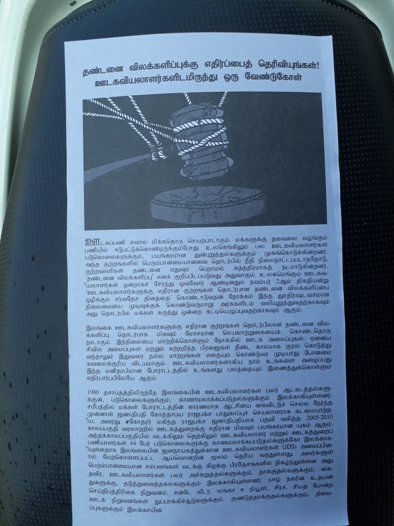 உலக ஊடகவிலாளர்களுக்கு எதிரான குற்றங்கள் தொடர்பான தண்டனை விலக்களிப்பை ஒழிக்கும் சர்வதேச தினத்தையிட்டு ‘; தண்டனை விலக்களிப்புக்கு எதிர்ப்பை தெரிவியுங்கள் ஊடகவியலாளர்களிடம் இருந்து ஒரு வேண்டுகோள்’ எனும் தொனிப் பொருளில் மட்க்களப்பு நகரில் இன்று புதன்கிழமை (02) துண்டுப்பிரசுரம் பிரசுரிக்கப்பட்டது