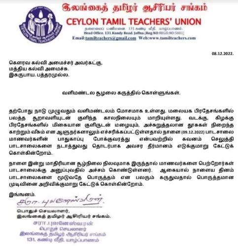 நாளை வெள்ளிக்கிழமையும் இன்று வியாழக்கிழமை மாதிரியான சூழ்நிலை நிலவுமாக இருந்தால் மாணவர்களை பெற்றோர்கள் பாடசாலைக்கு அனுப்புவதில் அச்சம் கொள்வர். ஆகையால் நாளை பாடசாலைகளை மூடுவதே பொருத்தம் என பலரும் கருதுவதால் பொருத்தமான முடிவினை அறிவிக்குமாறு கேட்டுக் கொள்கின்றோம். – என்றுள்ளது.