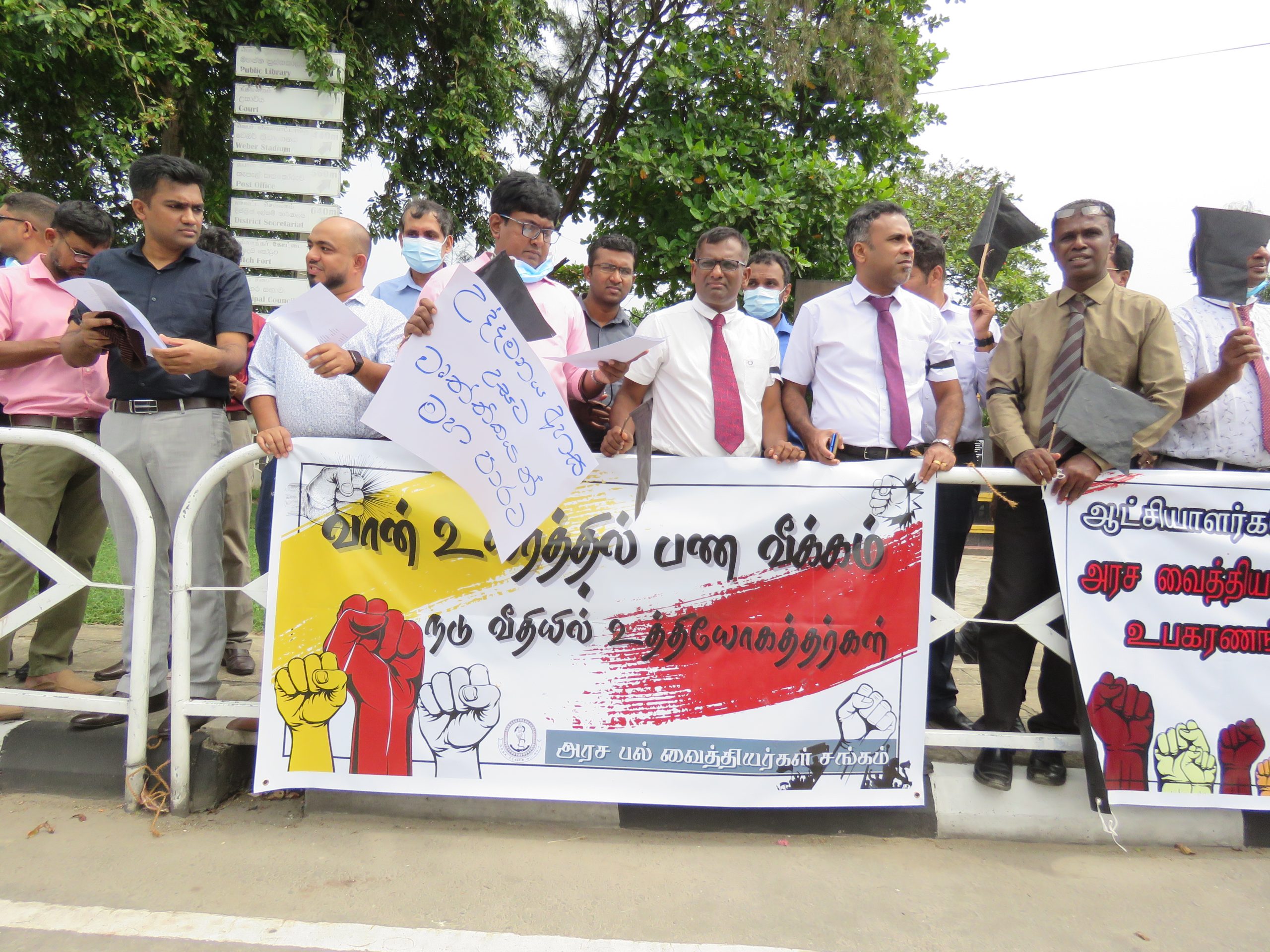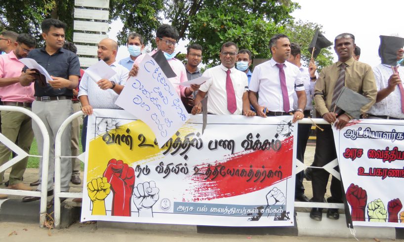 இதில் வானுயரும் வரிச்சுமை நாட்டை விட்டகலும் தொழில் வல்லுனர்கள், நண்பர்களுக்கு வரிச்சலுகை தொழில் வல்லுனர்களுக்கு வரிச்சுமை, வைத்தியசாலைகளில் மருந்து மற்றும் உபகரணங்களுக்கான தட்டுப்பாட்டை உடனடியாக தீர்க்கவும். போன்ற சுலோகங்கள் ஏந்தியவாறு கோஷங்கள் எழுப்புp ஆர்பாட்டத்தில் சுமார் ஒருமணித்தியாலம் ஈடுபட்ட பின்னர் ஆர்பாட்டகாராக்கள் அங்கிருந்து கலைந்து சென்றனர்.