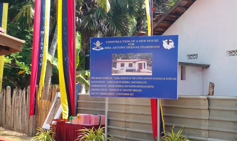 யாழ்ப்பாணம் வடமராட்சி வடக்கு பிரதேசத்திற்க்கு உட்பட்ட தும்பளை கிழக்கு பகுதியில் பெண் தலமைத்துவ குடும்பம் ஒன்றிற்க்கு ஓய்வு பெற்ற இராணுவ மேஜர் ஜெனர்ல ரவி ரட்ணசிங்கம் ஒழுங்கமைப்பில் வன்னி ஆதாரம், ஒனடா ஜீவ மீட்பரின் தமிழ் திருச்சபை,மோதறை லயன்கழக ஆதரவில் 551 வது படைப்பிரிவின் ஆளணி அனுசரணையுடன் வீடு ஒன்று இன்று கட்டுக் கொடுக்கப்பட்டுள்ளது.