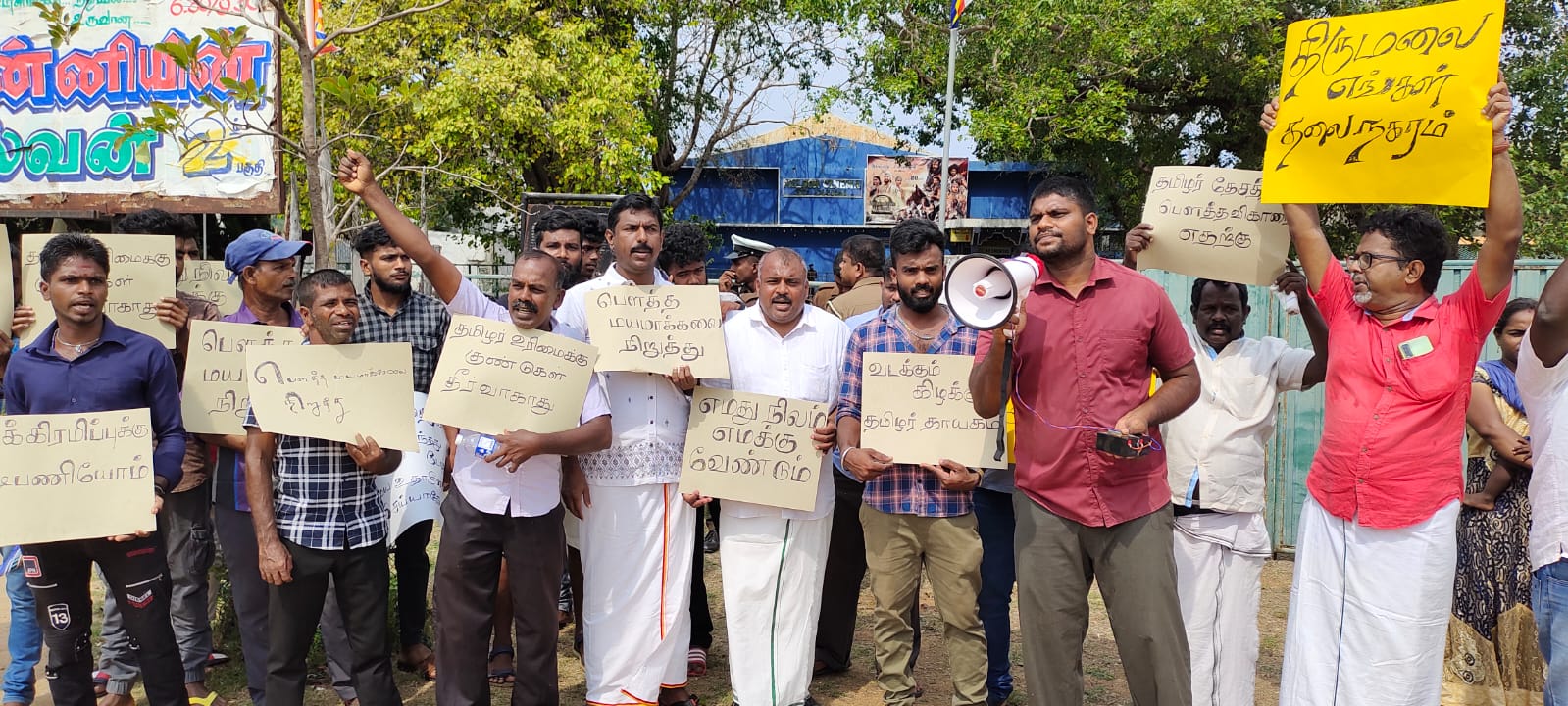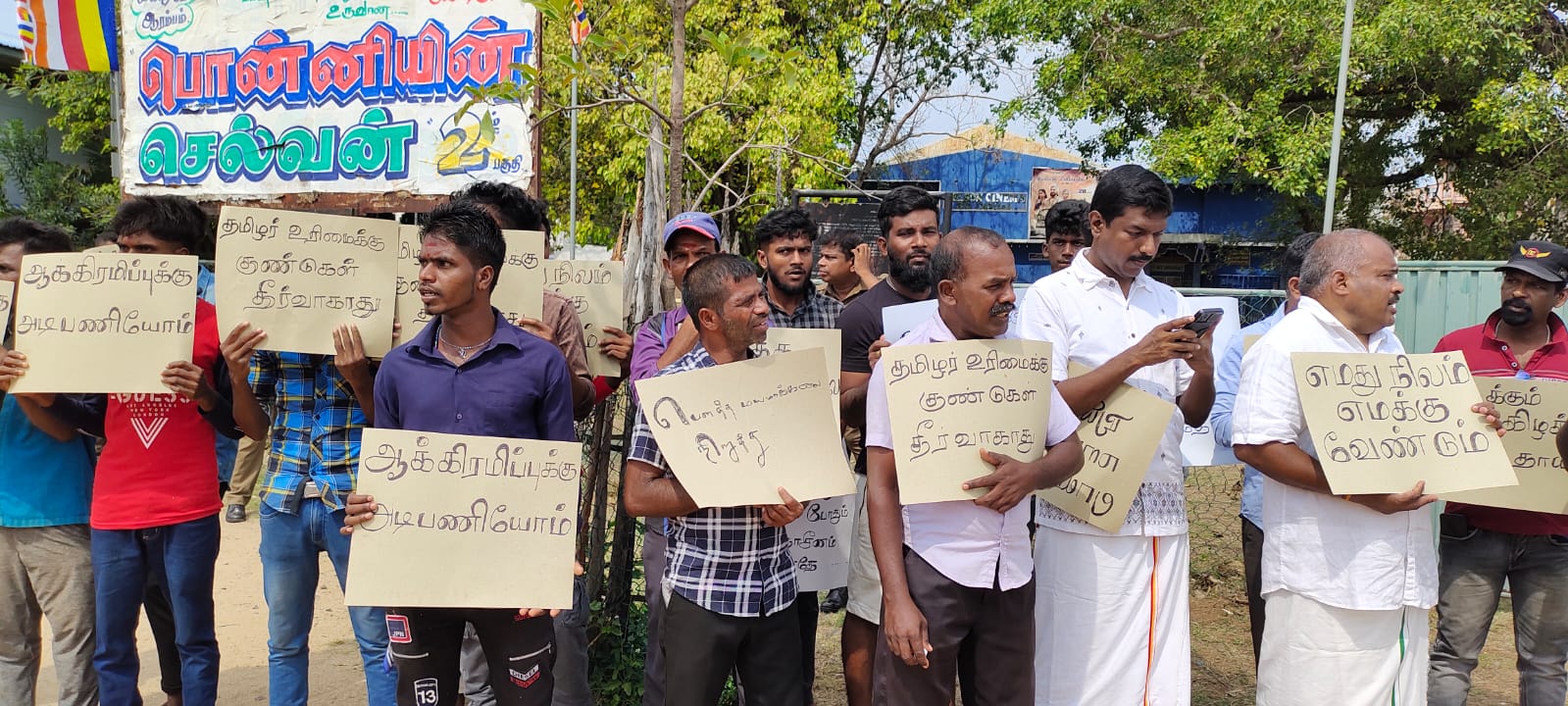இதனையறிந்த தமிழ் தேசிய முக்கள் முன்னணி கட்சி செயலாளரும் நாடாளுமன்ற உறுப்பினர் செல்வராசா கஜேந்திரன் தலைமையிலான கட்சி உறுப்பினர்கள் ஆதரவாளர்கள் நேற்று சனிக்கிழமை காலையில் பௌத்த சின்னங்களை நிறுவ ஏற்பாடு செய்யப்பட்ட காணிக்கு முன்பாக  ஓன்றிணைந்து தமிழ் உரிமைக்கு குண்டுகள் தீர்வாகாது, எமது நிலம் எமக்கு வேண்டும், மண்துறந்து புத்தருக்கு தமிழர் மண்மீது ஆசையா?