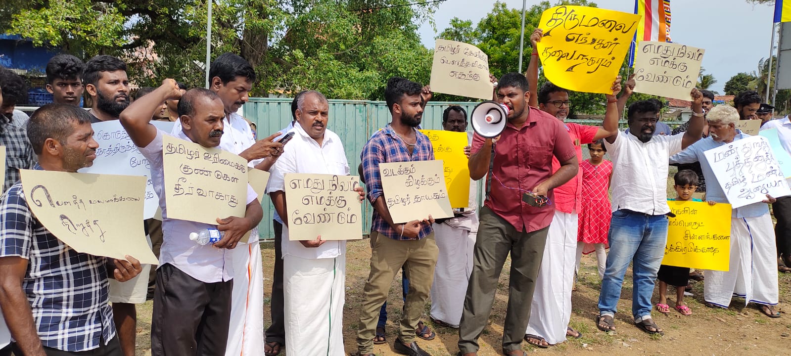திருமலை எங்கள் நகரம், ஆக்கிரமிப்பிற்கு அடிபணியோம், வடக்கும் கிழக்கும் தமிழ் தாயகம், போன்ற சுலோகங்கள் ஏந்தியவாறு கோஷங்கள் எழுப்பியவாறு நேற்று சனிக்கிழமை காலை 10 மணிக்கு ஆரம்பித்த ஆர்ப்பாட்டம் பகல் 2 மணிவரை ஈடுபட்டபின்னர் அங்கிருந்து விலகி சென்றனர்.
