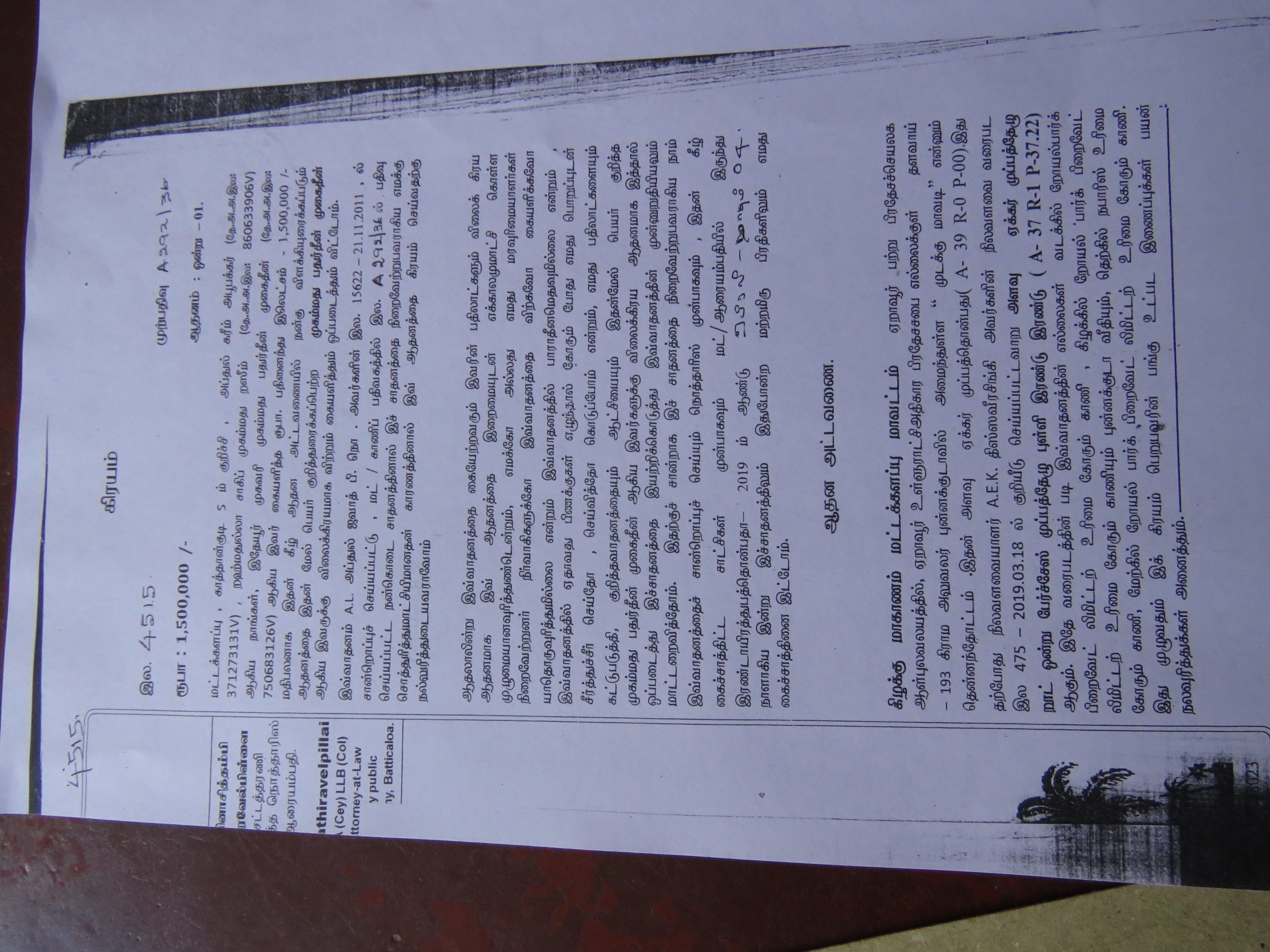 ஏறாவூர் புன்னக்குடா கடற்கரையை அண்டிய பகுதியான சிங்கள மீனவ வீட்டுத் திட்டத்திற்கு அருகாமையில் எனது பரம்பரைக்காணி எனது உறவினர் இருவாருக்கும் பங்காக இருந்த 39 ஏக்கர் காணியில் உறவினர்களான இருவரும் அவர்களின் பங்கை எனக்கு சட்டரீதியாக எழுதி தந்தனர்.