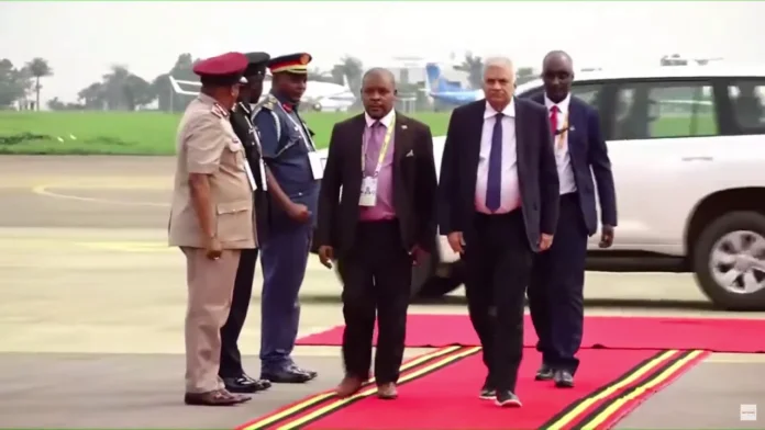 உகண்டாவுக்கு விஜயம் செய்துள்ள ஜனாதிபதி ரணில் விக்கிரமசிங்கவுக்கு துப்பாக்கி வேட்டு முழக்கத்துடன் வரவேற்பு அளிக்கப்பட்டது.