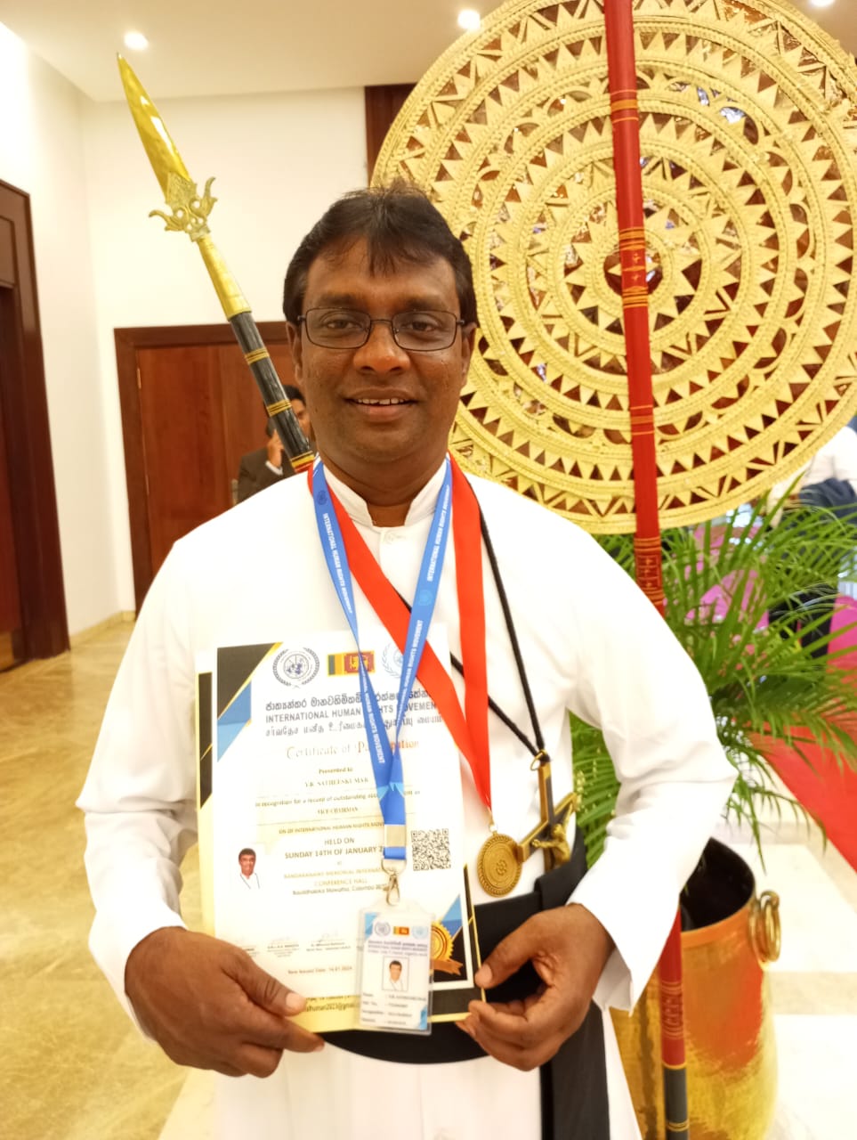 சமூக நீதியை நிலைநாட்டவும், மனித தர்மத்தைக் காக்கவும் ஆற்றிவரும் பணிக்காக இலங்கை அரசினால் வழங்கப்படும் உயர் விருதான ‘ *தேசபந்து மனிதாபிமானம் மிக்கவர்’* விருது வழங்கி மதிப்பளிக்கப்பட்டதோடு இந் நிகழ்வில் அவர் சர்வதேச மனித உரிமைகள் பாதுகாப்பு மையத்தின் கிளிநொச்சி மாவட்டத்திற்கான துணைத் தலைவராகவும் நியமிக்கப்பட்டுள்ளார்.