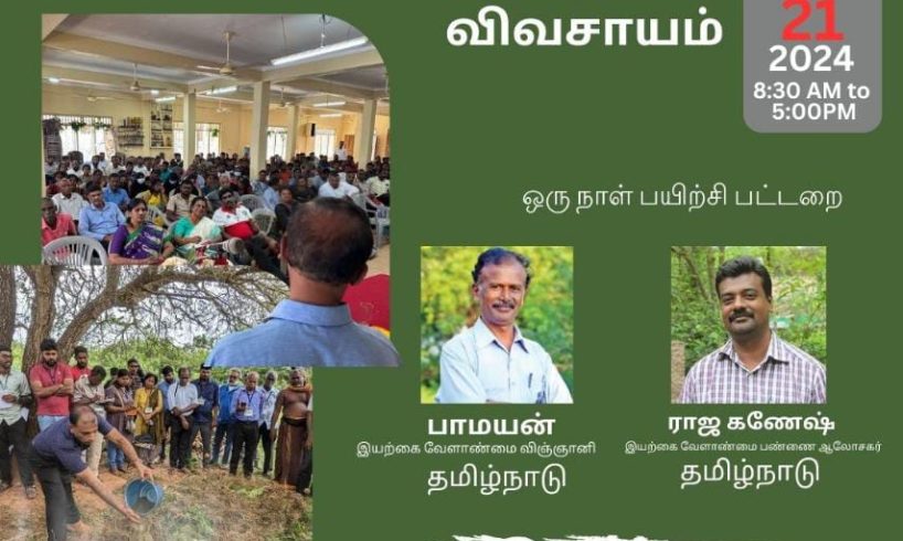 தமிழ்நாட்டின் இயற்கை விவசாய விஞ்ஞானி பாமயன் அவர்களால் நடாத்தப்படும் எளிய முறையில் இயற்கை விவசாய பயிற்சி பட்டறை 21.01.2024 ஞாயிற்றுக்கிழமை காலை 8.30 மணிக்கு, யாழ்ப்பாணம் வடமராட்சி தெற்கு மேற்கு (கரவெட்டி) பிரதேச சபை மண்டபத்தில் ஆரம்பமாகிறது.