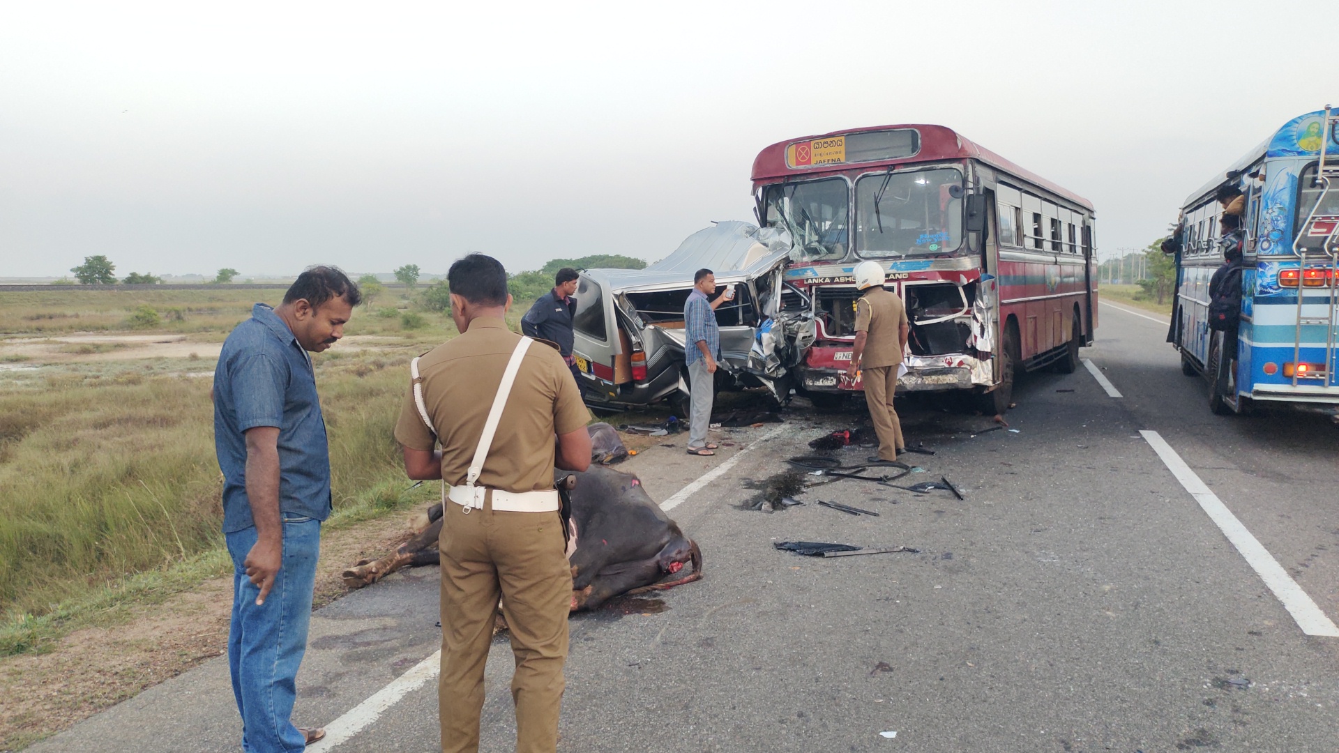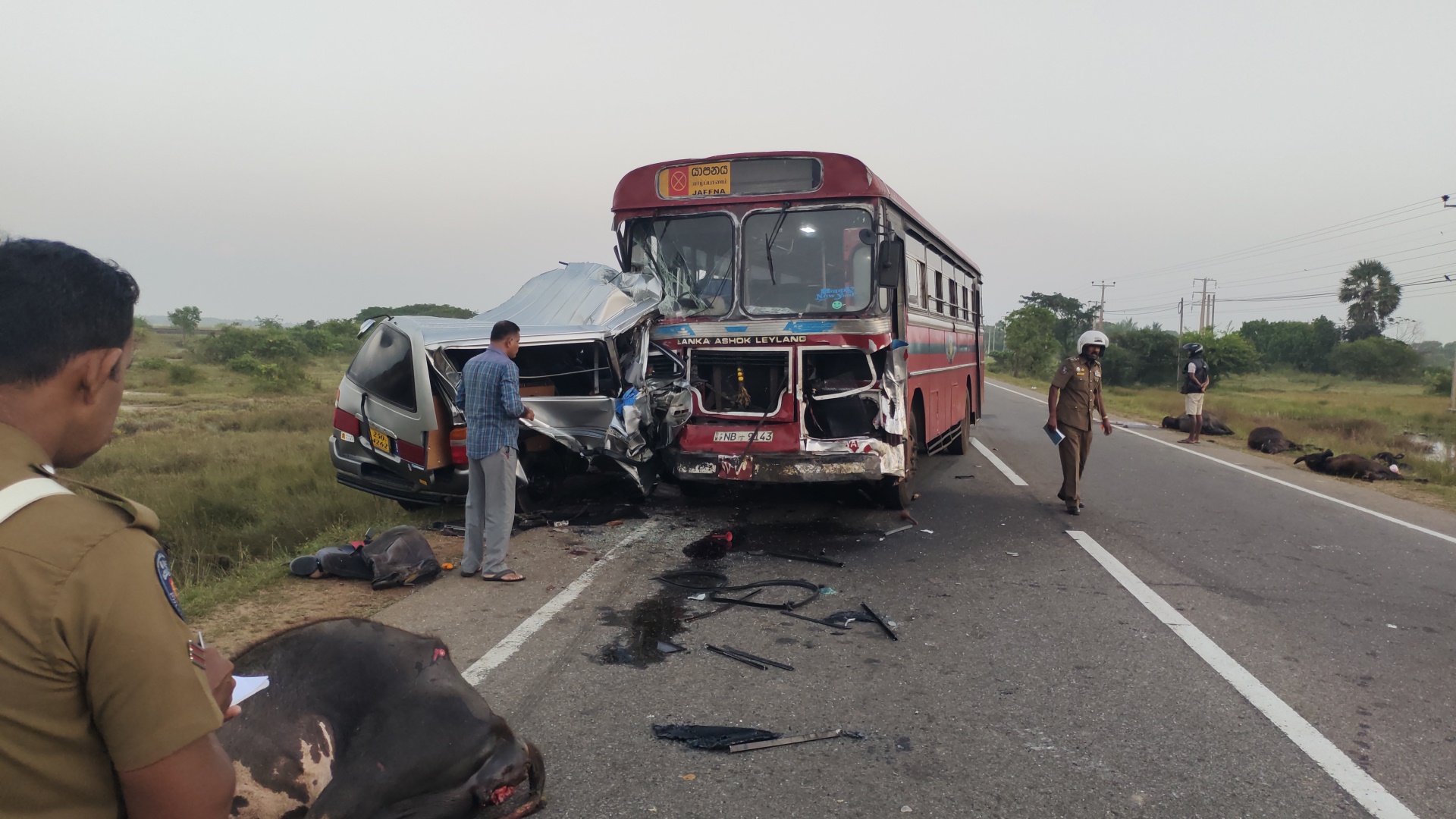 குறித்த பேருந்து விதியில் பயணித்த மாடுகளுடன் மோதிய பின் வானுடன் மோதி குறித்த விபத்து இடம்பெற்றுள்ளது.