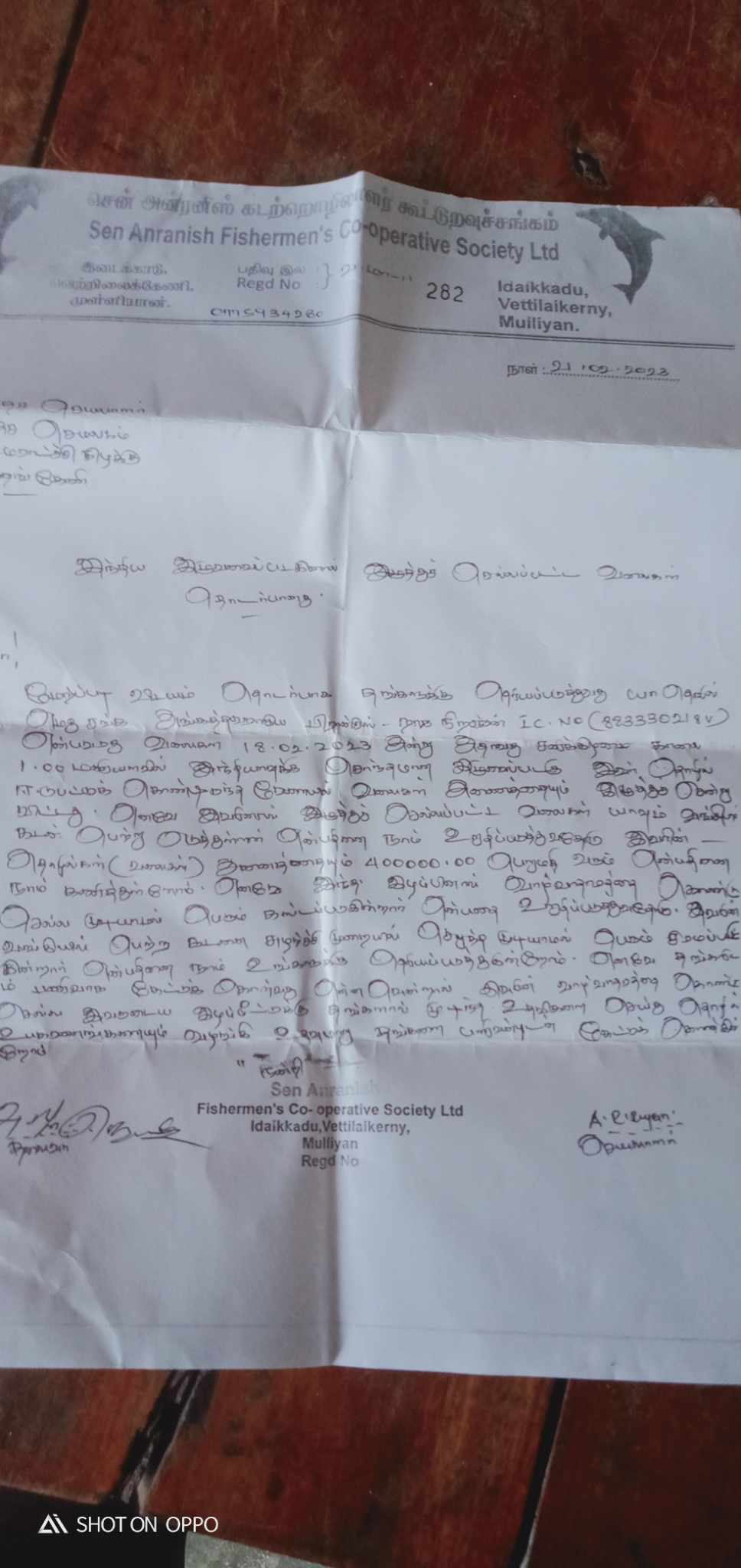 மிகுதி இரண்டு மீனவர்கள் சொற்ப வலைகளுடன் அவர்களும் கரைக்கு திரும்பி வெற்றிலைக்கேணி கடற்றொழிலாளர் சங்கத்தினரிடம் சம்பவம் குறித்து முறையிட்டனர்.