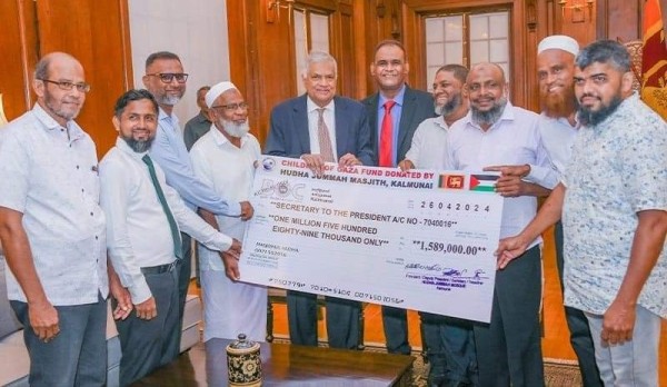 ஜனாதிபதி ரணில் விக்ரமசிங்கவின் யோசனையின் பேரில் காஸா பகுதியில் இடம்பெற்ற மோதல்களினால் பாதிக்கப்பட்ட சிறுவர்களுக்கு நிவாரணம் வழங்கும் நோக்கில் ஆரம்பிக்கப்பட்ட காஸா சிறுவர் நிதியத்திற்கு கல்முனை ஹுதா ஜும்மா பள்ளிவாசலினால் பொதுமக்கள் மற்றும் தனவந்தர்களின் அன்பளிப்பாக கிடைக்கப்பெற்ற 1,589,000.00 நிதி நேற்று ஜனாதிபதி செயலகத்தில் வைத்து ஜனாதிபதி ரணில் விக்ரமசிங்கவிடம் உத்தியோகபூர்வமாக வழங்கி வைக்கப்பட்டது.