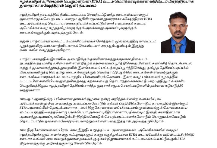 2009ஆம் ஆண்டுக்குப் பின்னான தாயகச் சூழலை நன்கு அறிந்தவர் என்ற வகையில், வட அமெரிக்காவிலுள்ள அனைத்து அமைப்புகளோடும் மக்கள் பிரதிநிதிகளோடும் தாயகத்தில் இயங்கும் ETRA அமைப்பின் தொடர்பாளராக -2026 திருகோணமலைப் பிரகடனம் முன்வைக்கும் கொள்கையை மையப்படுத்தி எந்தவொரு புலம்பெயர் அமைப்பு ரீதியான சார்பு நிலையும் இன்றி, சுயாதீனமாக அனைத்து அமைப்புகளோடும், பிரதிநிதிகளோடும், செயற்பாட்டாளர்களோடும், பொதுமக்களோடும், தொடர்பாடும் தகைமையோடு செயலாற்றுவார் என்பதை இத்தால் அறியத்தருகிறோம் என்றும்  2026 திருகோணமலைப் பிரகடனம் இறுதிப்படுத்தப்பட முன்னதாக வட அமெரிக்காவில் வாழும் ஈழத்தமிழர்களும், அவர்களது நட்புறவுகளும், தமது கருத்துக்களை ETRA வட அமெரிக்க வதிவிடப்பிரதிநிதி ஊடாக உங்கள் அனைவருக்குமான தாயகக் குடிசார் நிறுவனமாகக் கட்டமைக்கப்பபட்டுவரும் ETRA நிறுவனத்துக்கு அறியத்தருமாறு வேண்டுகிறோம் என்றுள்ளது