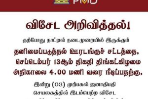 நாட்டில் தற்போது அமுல்படுத்தப்பட்டுள்ள தனிமைப்படுத்தல் ஊரடங்கானது மேலும் நீடிக்கப்படுவதாக அறிவிக்கப்பட்டுள்ளது. இந்த விடயத்தை இலங்கை சுகாதார அமைச்சர் கெஹெலிய ரம்புக்வெல சற்றுமுன் அறிவித்துள்ளார். இது தொடர்பில் தனது உத்தியோகபூர்வ டுவிட்டர் பக்கத்தில் அவர் பதிவொன்றை இட்டுள்ளார். அதன்படி எதிர்வரும் 13ஆம் திகதி வரை தனிமைப்படுத்தல்... Read more »